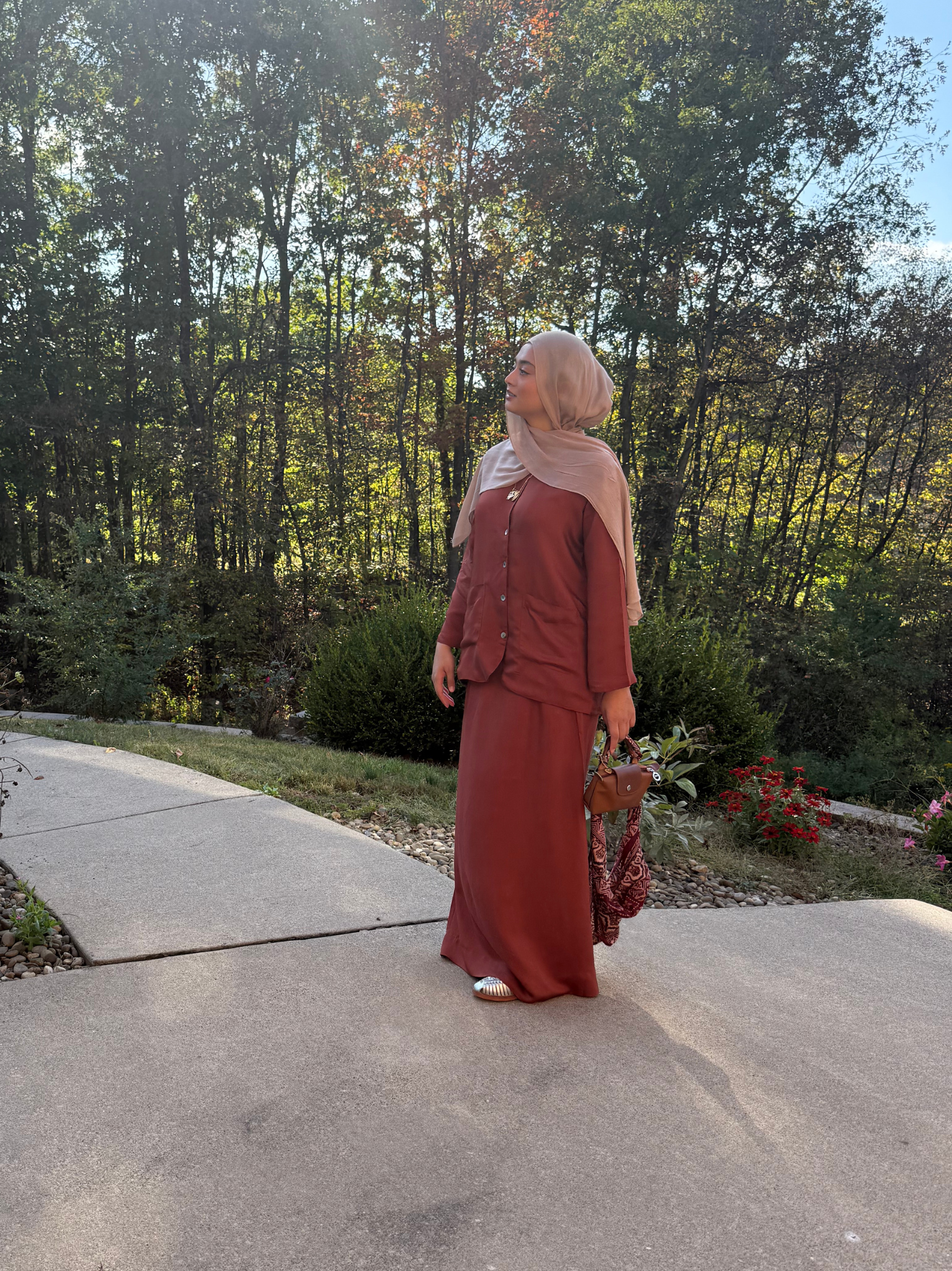 Crafted in bayon viscose with a soft, fluid drape and linen lining for breathability, this rust-toned two-piece set features a button-down tunic top with a clean round neckline, short sleeves, and functional front patch pockets. The easy, relaxed silhouette flows into a matching straight-cut skirt with a back slit, offering freedom of movement with a polished finish.