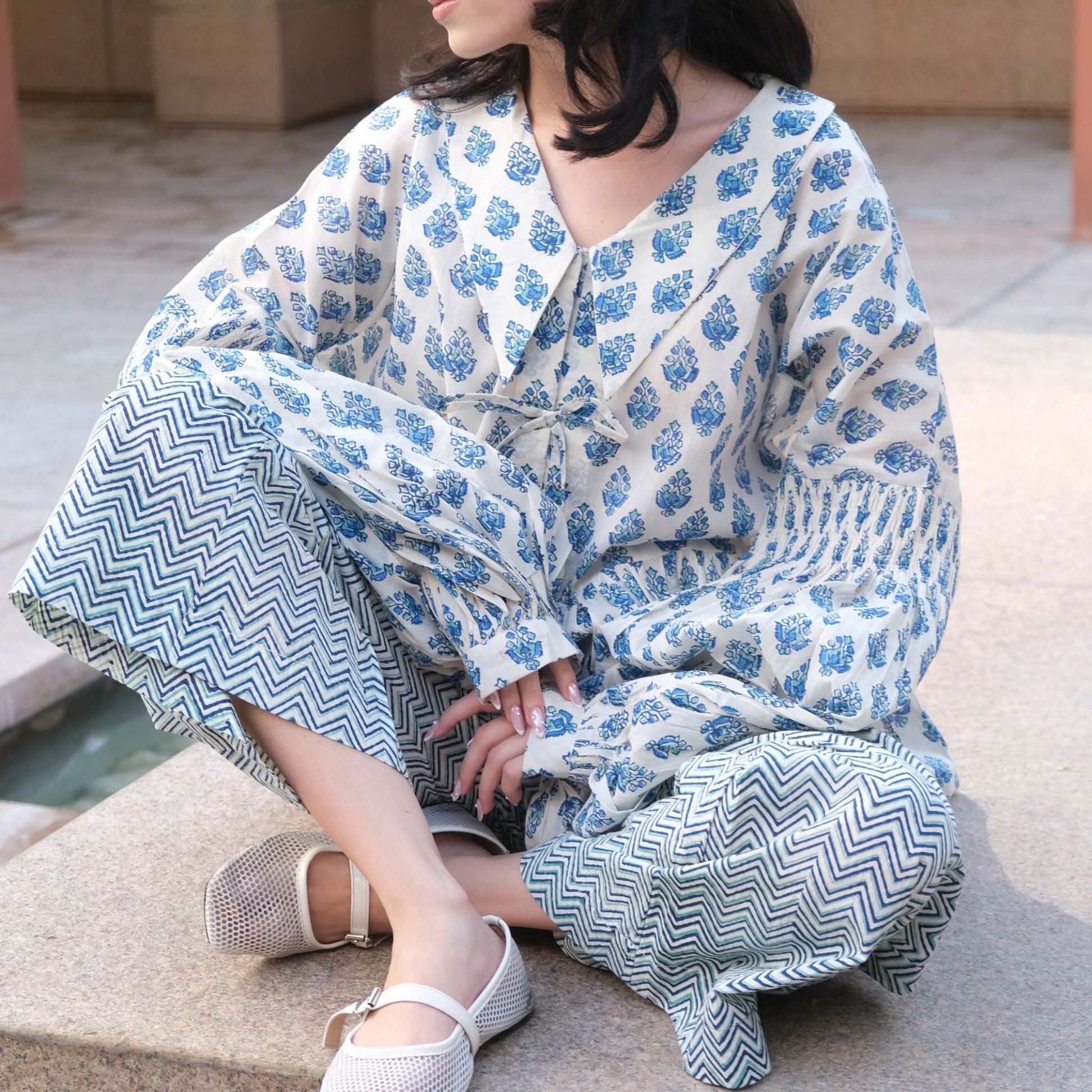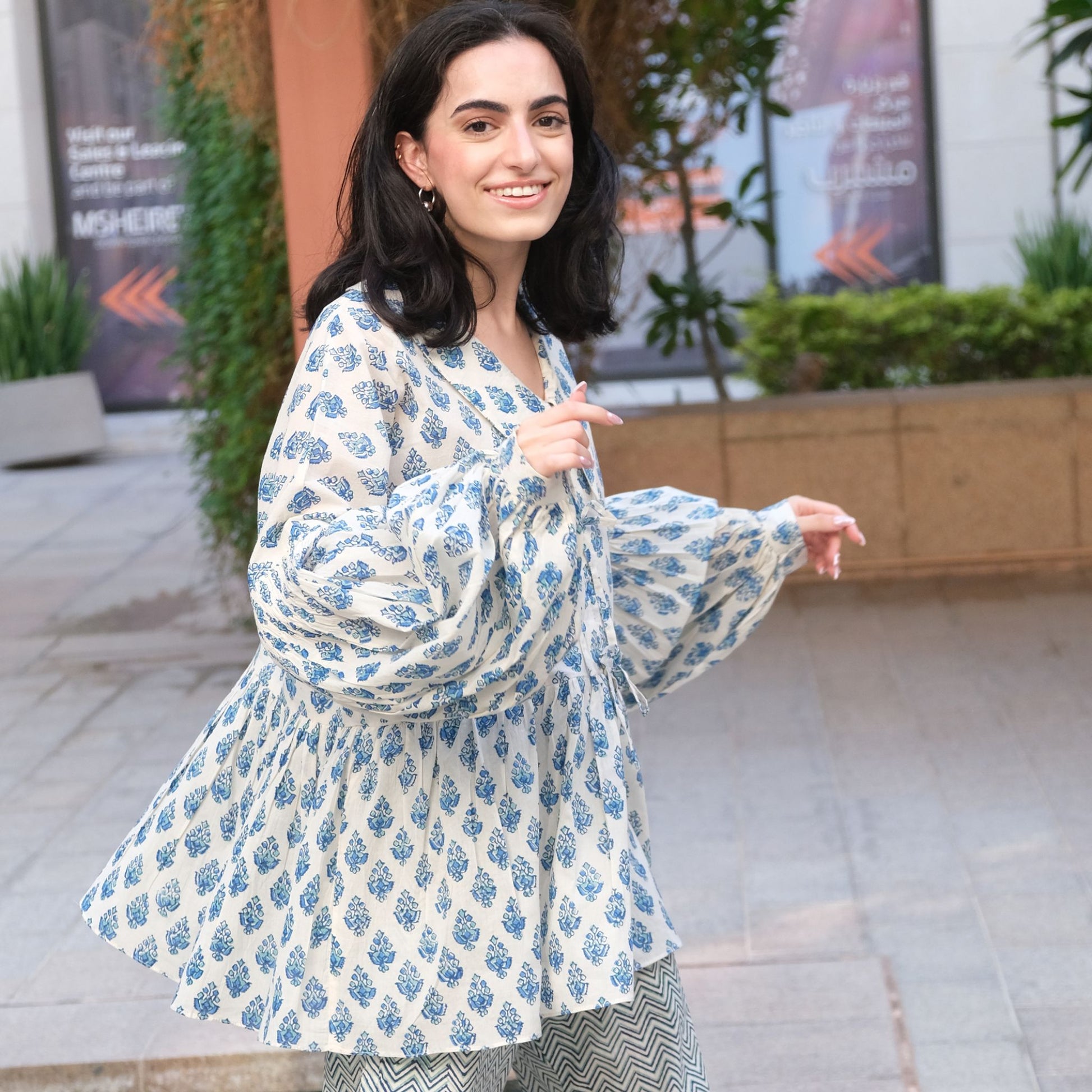 This artisanal hand-blocked top combines timeless charm with elegant tailoring. It features a softly gathered peplum silhouette that flows gracefully for a flattering fit. The round neckline is enhanced by a subtle V-slit and a short button placket, adding a refined detail to the design. The long, voluminous bishop sleeves are cinched with buttoned cuffs, creating a graceful drape that elevates the overall look. The intricate hand-blocked floral motifs in soft blue on an off-white base lend a vintage-inspired yet contemporary vibe.