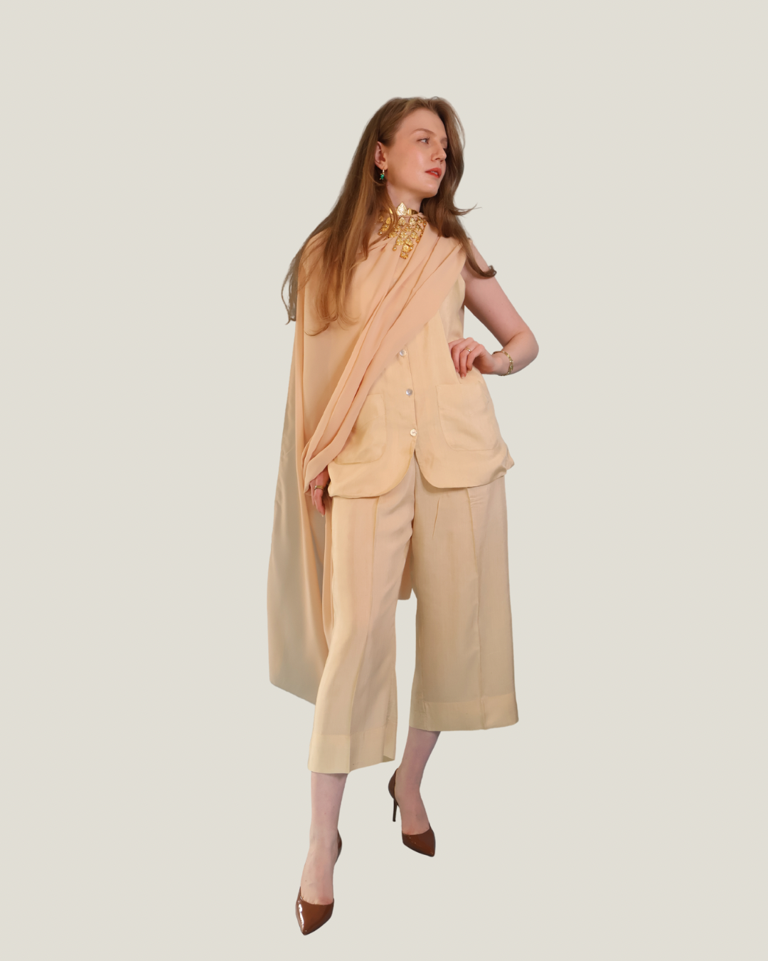 The sleeveless button-down top features a soft round neckline and roomy patch pockets, creating a relaxed yet tailored silhouette. Paired with cropped wide-leg trousers with crisp pleats, it drapes beautifully while offering easy movement and a flattering fit.