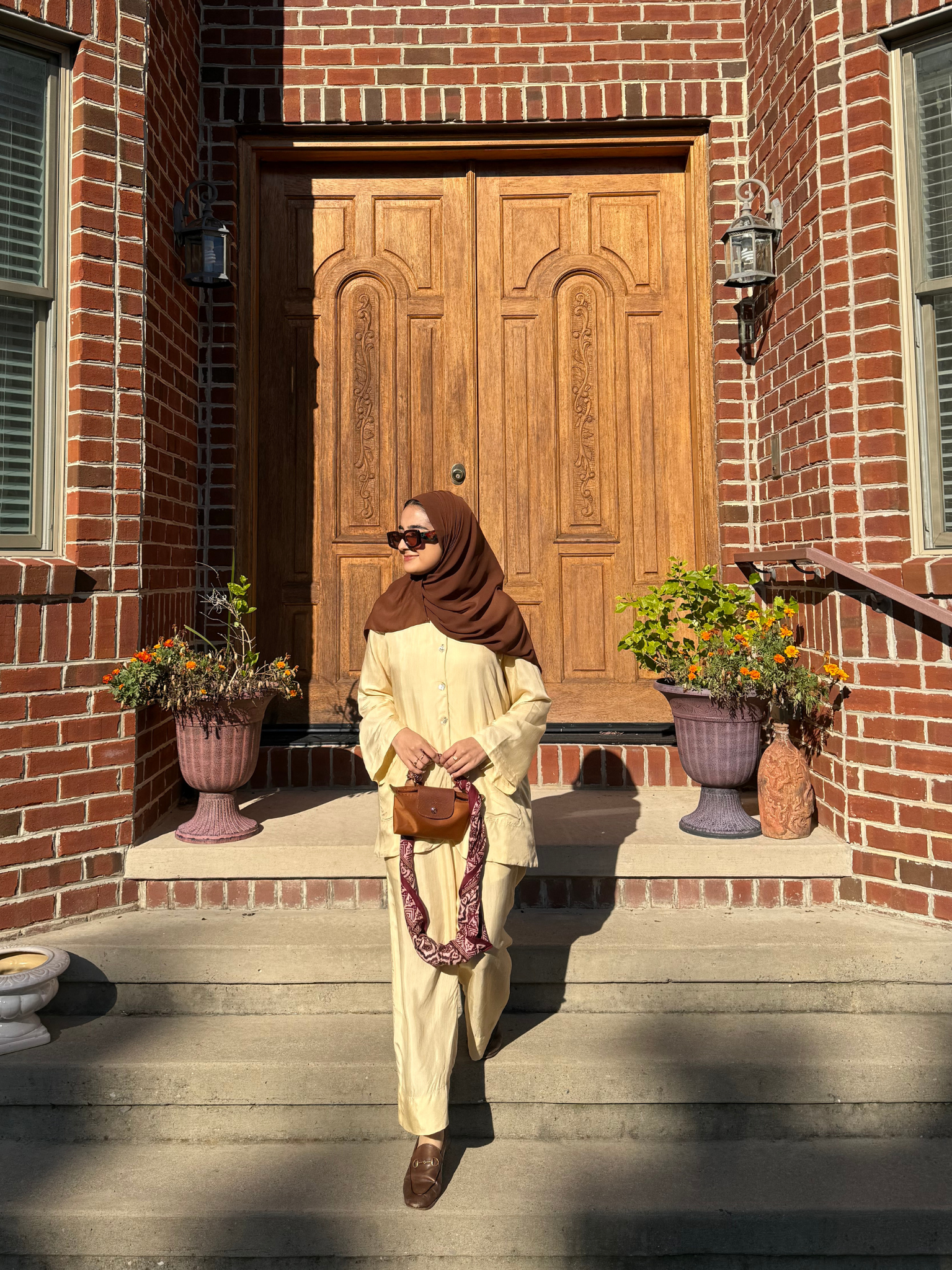 Our Eden Pearl Co-Ord Set is designed for the woman who loves subtle sophistication with a modern edge. Crafted from lightweight, breathable bayon-viscose fabric, this set brings comfort and quiet luxury together in one polished look.