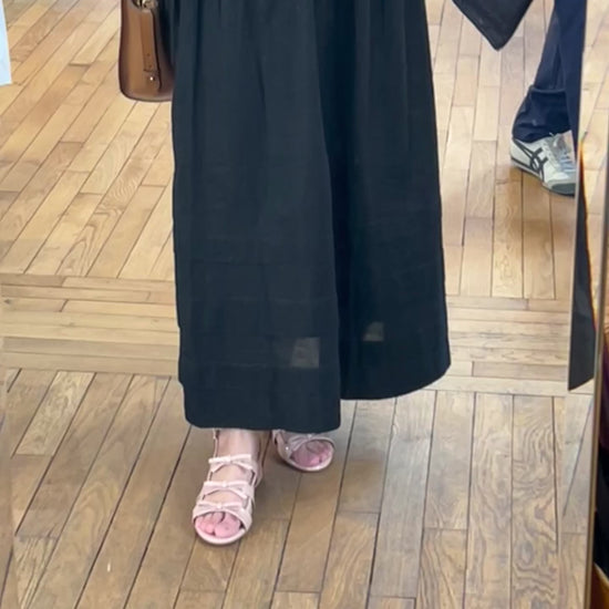 Crafted from cotton fabric, the skirt features horizontal sheer panel stripes that add depth and texture without compromising breathability. The voluminous cut flows gently with every step, while the elasticated waistband ensures comfort and ease. Whether styled with a tucked-in blouse or layered with statement jewelry, it’s a versatile piece made for quiet sophistication.