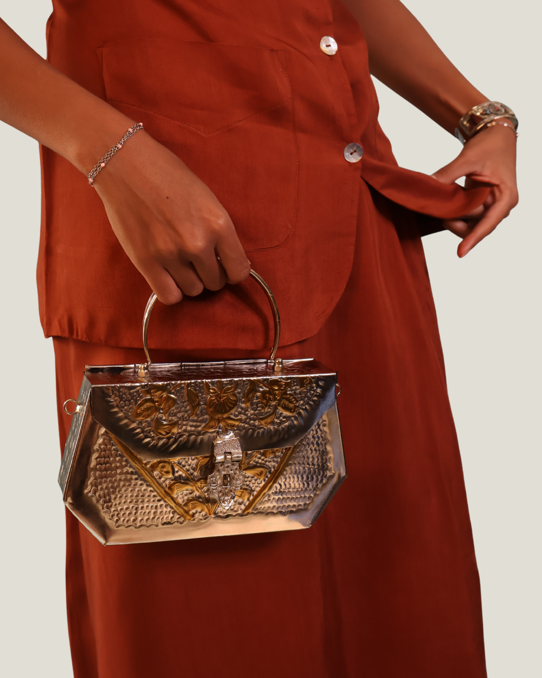 Crafted in bayon viscose with a soft, fluid drape and linen lining for breathability, this rust-toned two-piece set features a button-down tunic top with a clean round neckline, 3 quarter sleeves, and functional front patch pockets. The easy, relaxed silhouette flows into a matching straight-cut skirt with a back slit, offering freedom of movement with a polished finish.