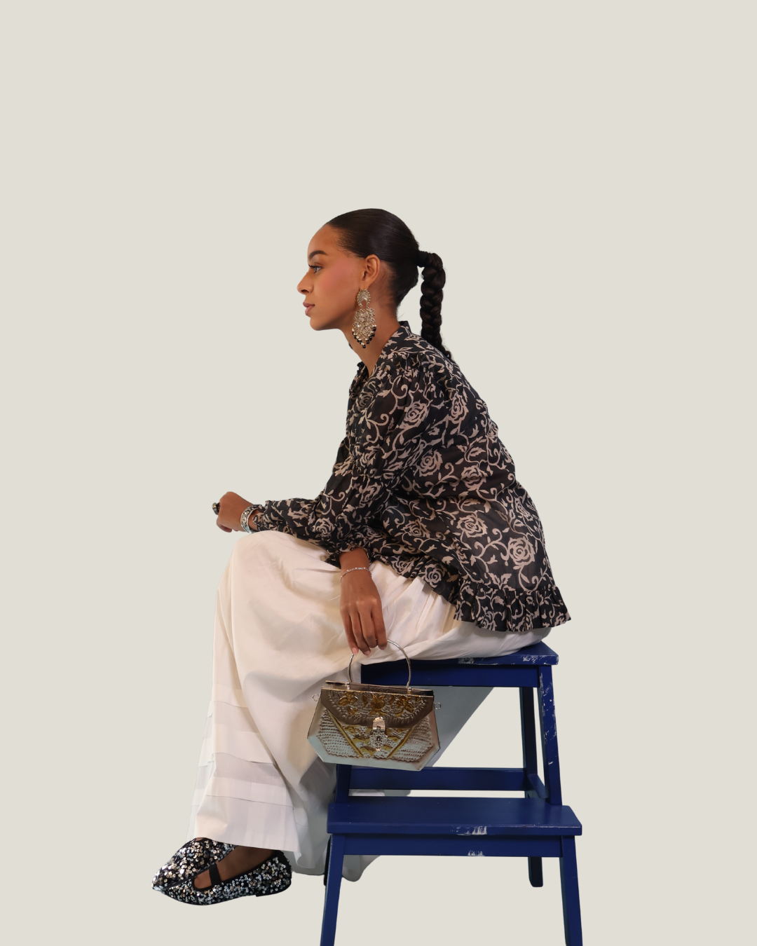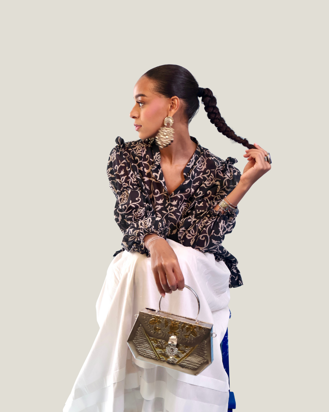 Our Lila Top is a graceful fusion of structure and softness, designed to elevate your everyday wardrobe with a touch of vintage charm. Handcrafted(block printed) in a lightweight cotton blend, it features an intricate ivory floral print against a deep black base a classic contrast that never fades.