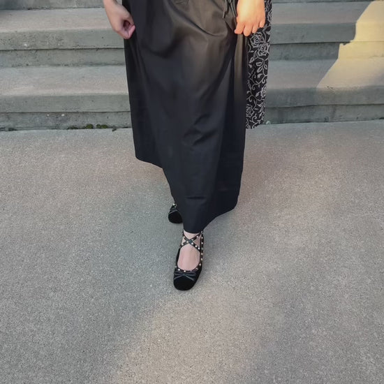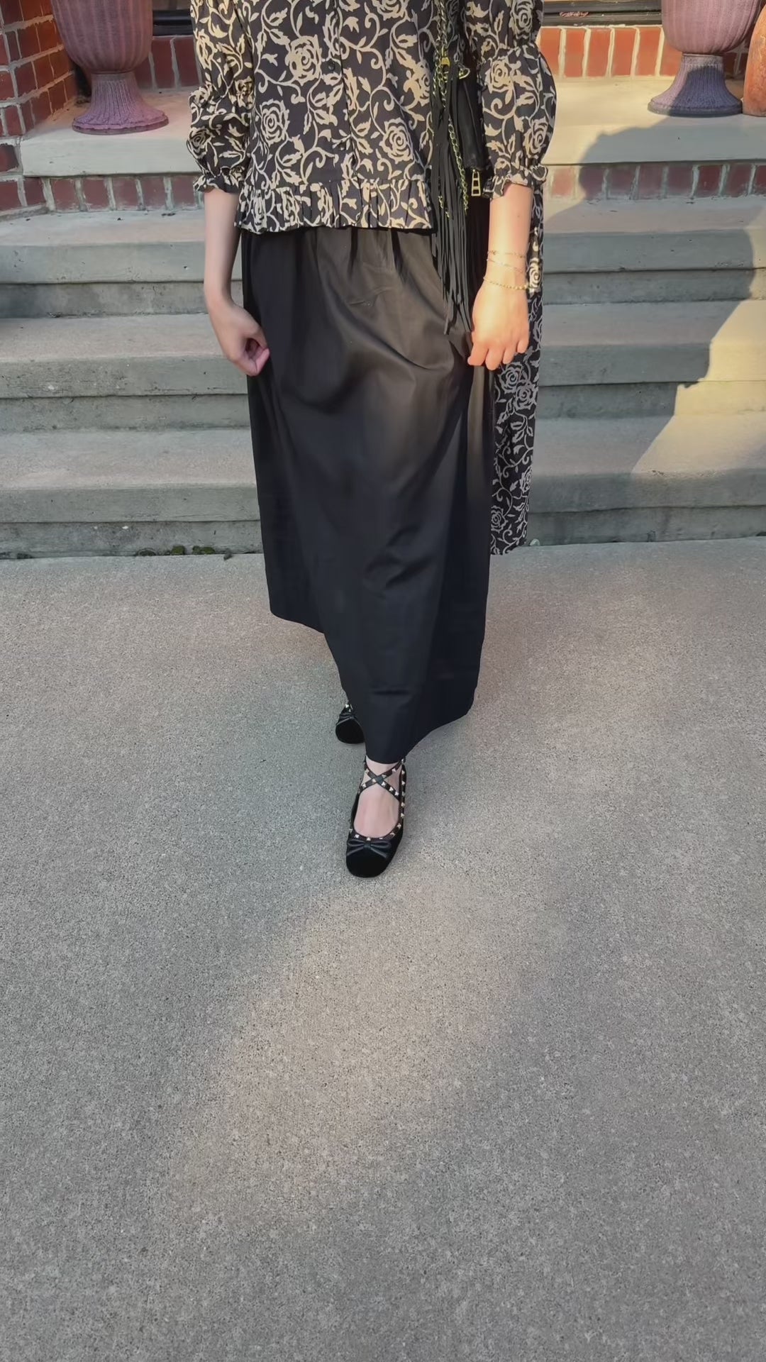 - Color: Black base with ivory floral print