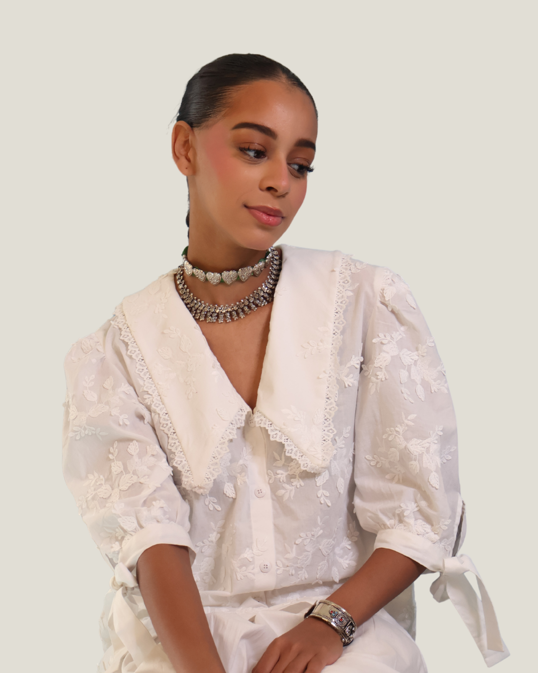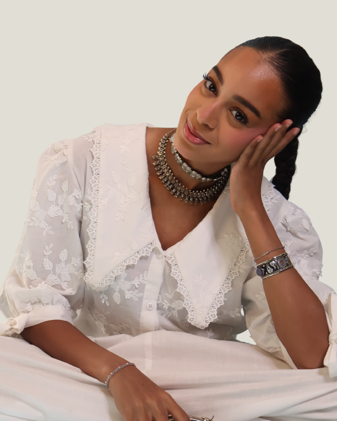 Timeless, romantic, and delicately detailed our Lily Top is an ode to quiet luxury and hand-touched charm. Made from soft cotton with intricate white-on-white floral embroidery, this button-down top features an elegant oversized collar, finished with scalloped lace trim that adds just the right amount of drama.