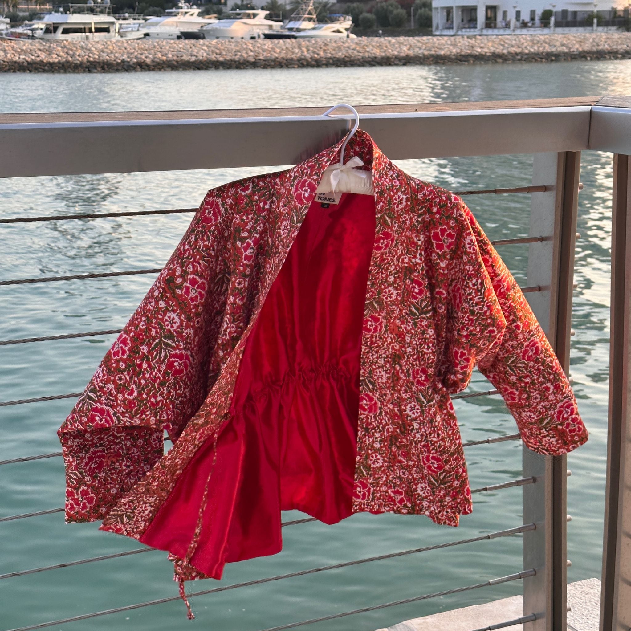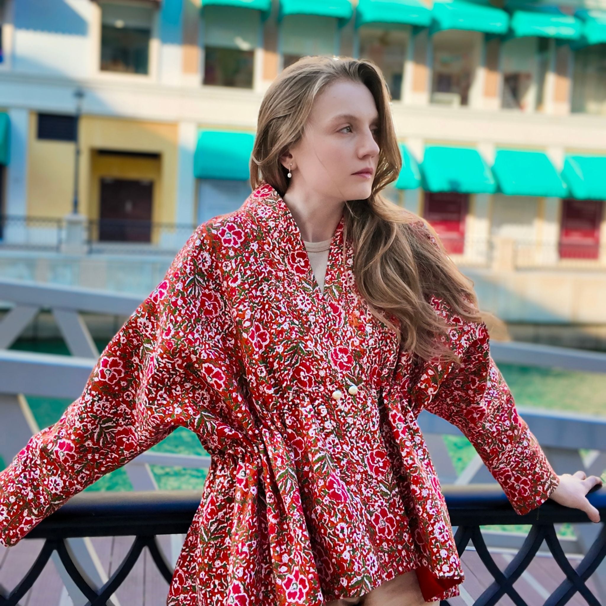 The Rouille Jacket is a hand-blocked drawstring piece adorned with intricate stitched detailing along the neckline, sleeves, and hem. Designed for versatility, it features front buttons and an adjustable drawstring, allowing it to be worn gathered or loose. The warm rust hue is complemented by a lining of luxurious reddish silk, adding a touch of opulence to this timeless design.