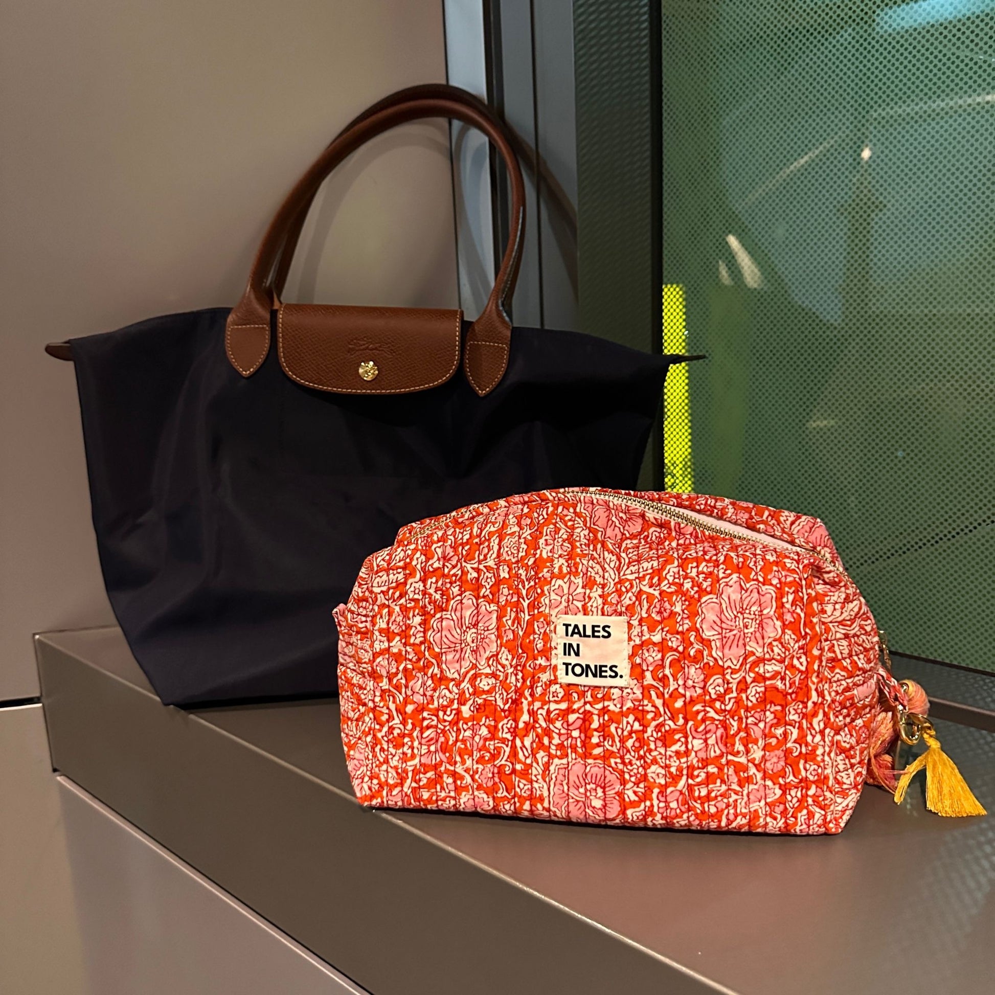 The Routine Luxe Pouch is a perfect blend of practicality and elegance. Hand-blocked with intricate designs, this pouch features extra inner pockets to keep your skincare, makeup, and essentials organised. The liquid-absorbing inner lining adds functionality, ensuring any spills are quickly absorbed, keeping your items safe. A golden zipper elevates the luxe look, making it a standout accessory for your daily routine or travel adventures. Whether carrying it for a more organized vacation or slipping it into your tote bag to keep your handbag neat, this pouch is the ideal combination of beauty and convenience.