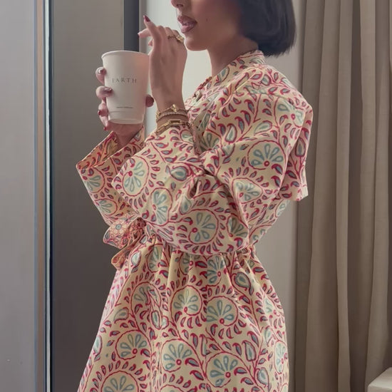 This exquisitely designed midi trench coat draws inspiration from the bright, uplifting patterns and rich heritage of artisanal block printing. Hand-blocked with precision, it showcases a beautiful, swirling Soleil motif in a warm, buttery yellow accented with rich ruby and soft cerulean tones.