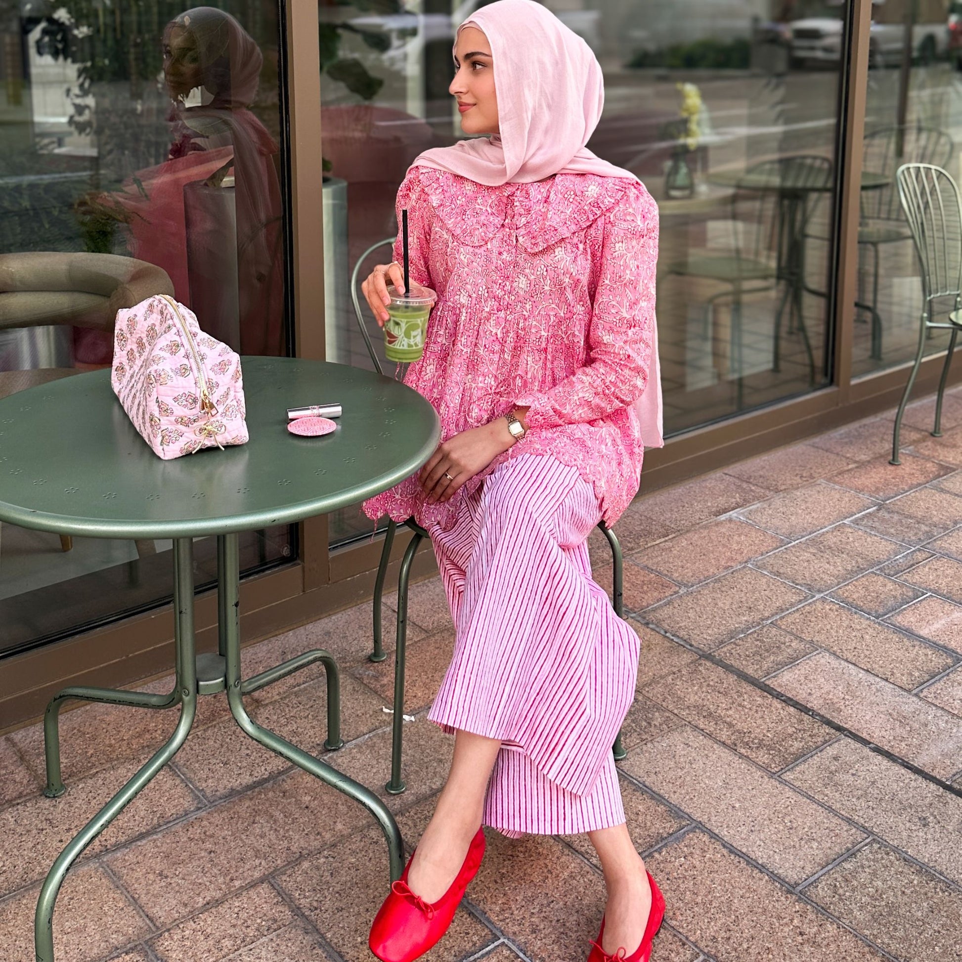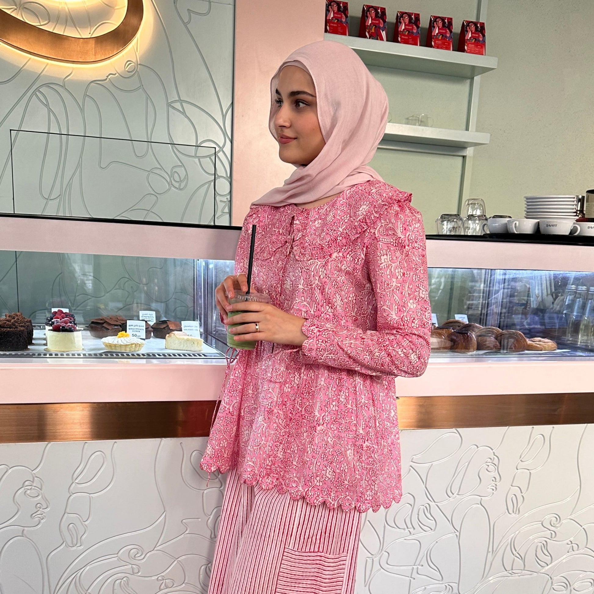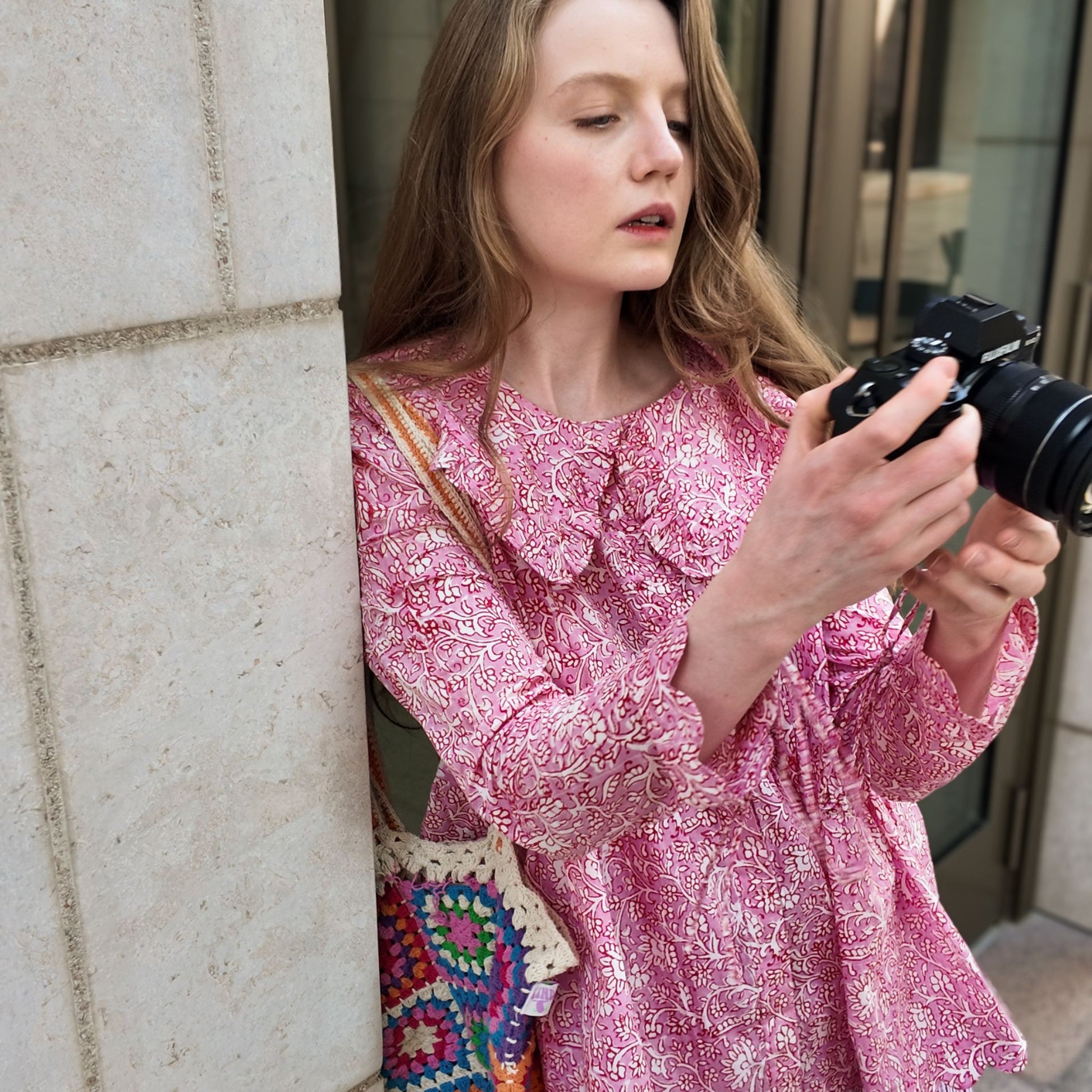 This charming top combines vintage-inspired design with effortless elegance. It features a sweet Peter Pan collar with scalloped edges, a gathered empire waist that flows into a relaxed, flared silhouette, and long sleeves with delicate scalloped hems. The sleeves also feature long knots that can be beautifully tied into a bow, adding a unique and refined touch. The soft pink floral hand-blocked print enhances the romantic vibe, making it both flattering and comfortable.
